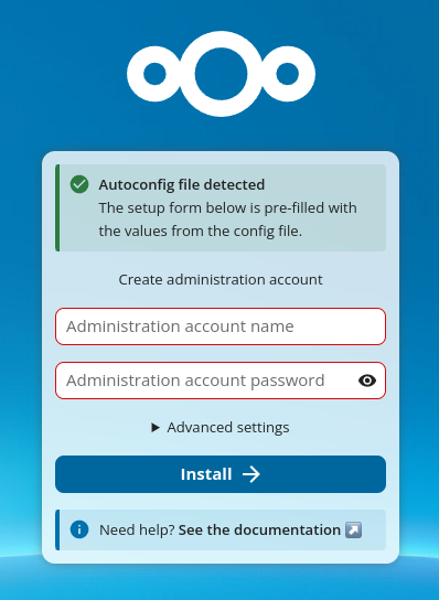 If an autoconfig file is detected, the wizard displays a success notice: “Autoconfig file detected — The setup form below is pre-filled with the values from the config file.” The Storage & database section is automatically collapsed when the autoconfig provides valid values. For details on autoconfig files, see Automatic setup.