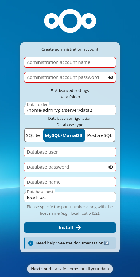 When Nextcloud prerequisites are fulfilled and all Nextcloud files are installed, the last step to completing the installation is running the Installation Wizard. This is just three steps: